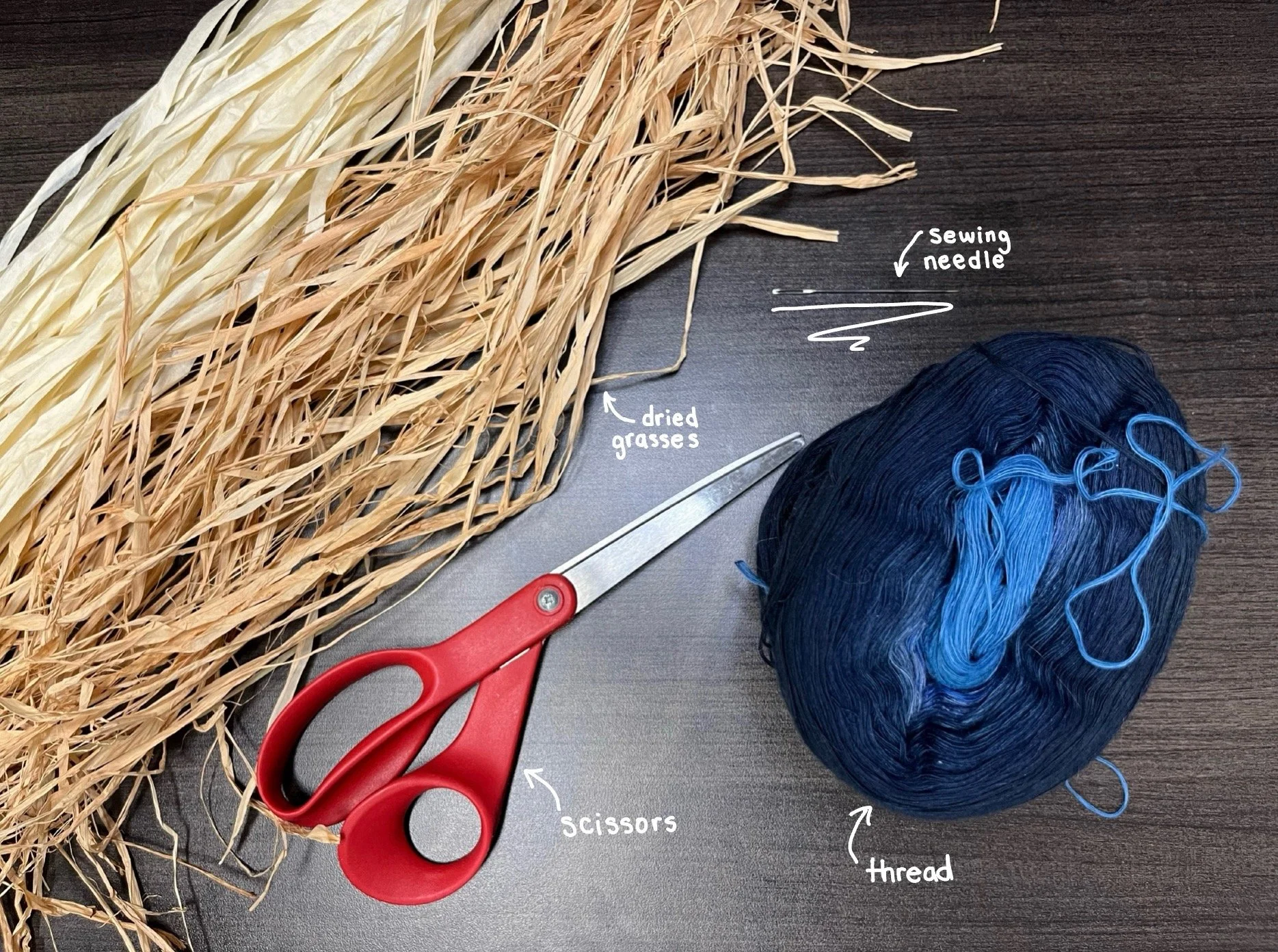 Abbey’s supplies: dried grass, scissors, a sewing needle, and thread