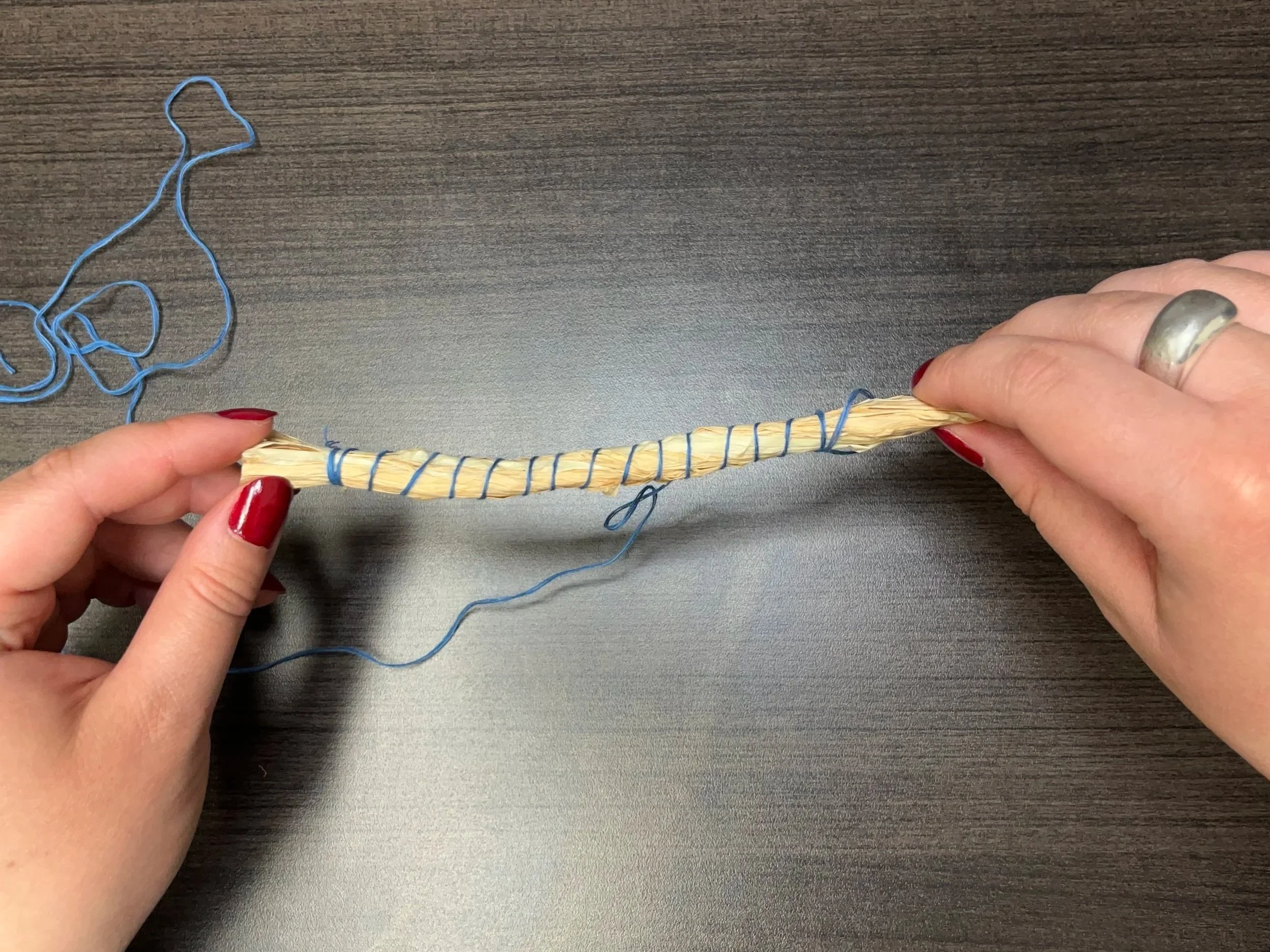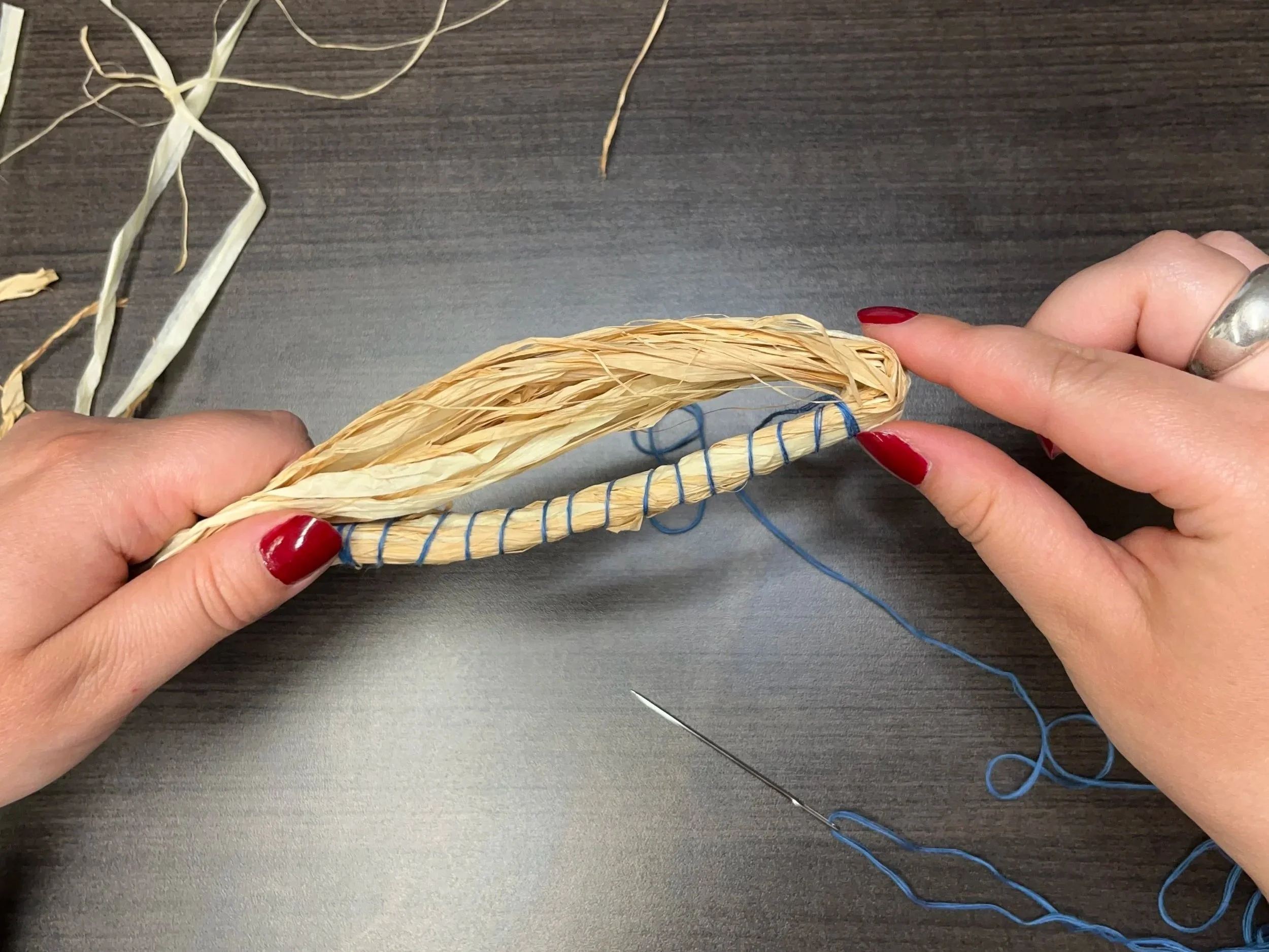 Once you have stitched the unwrapped grass to equal the length of the initial bundle, you will have two wrapped bundles that are attached.